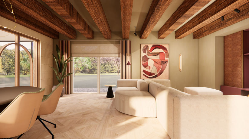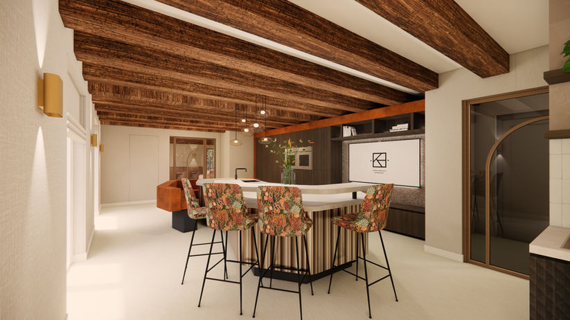 De wens van de klant was om veel kleur en bonte details terug te laten komen zodat het eindresultaat een warm en uitnodigend geheel wordt. De bijzondere Octa keuken vormt het middelpunt van de woning en hier kan met het hele gezin gegeten en geborreld worden. De balken in de keuken en de woonkamer worden bewaard gebleven en vormen een mooie contrast met de moderne elementen die toegevoegd gaan worden.