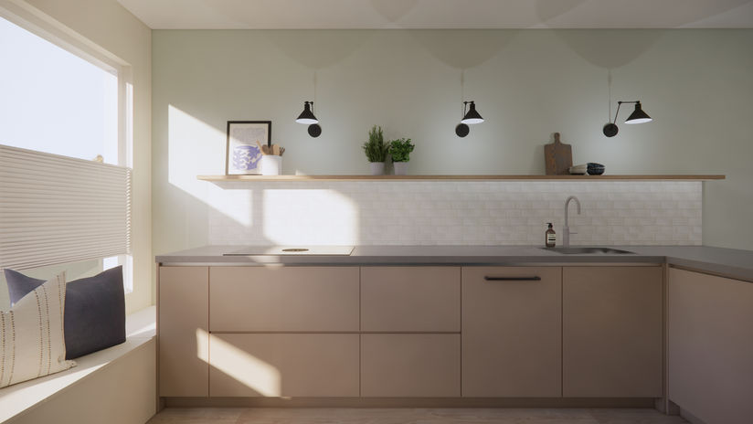 Voor dit ontwerp hebben we de keuken verplaatst naar de voorkant van de woning. Omdat er vaak visite over de vloer komt was er vraag naar genoeg zitplekken in de keuken met het liefste een barretje erbij. Door het verplaatsen van de keuken naar de voorkant hebben we meer ruimte weten te creëren voor opbergen maar ook voor een barretje.
